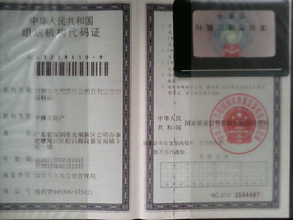深圳市光明新区公明百利宝丝印器材店 >> 资质证书